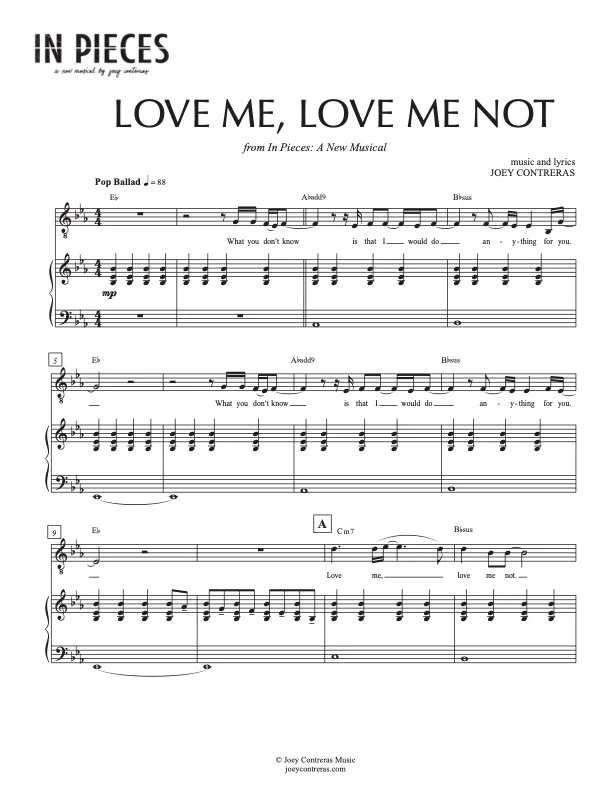 This sheet music is for “Love Me, Love Me Not” as performed by David Archuleta on In Pieces: A New Musical (Highlights), in Eb Major, 2 steps below David’s recording and 9 steps lower than the original published key.