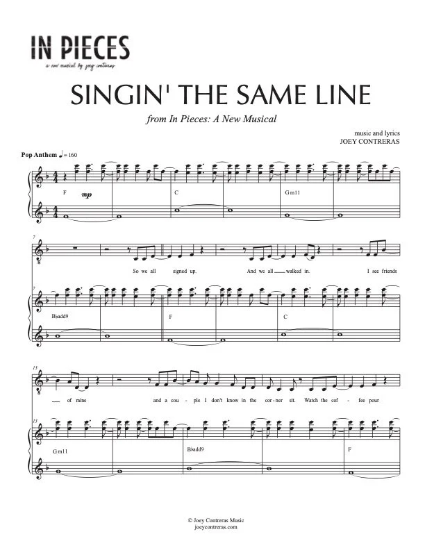 This sheet music is for “Singin’ the Same Line” from In Pieces as sung by Solea Pfeiffer, in the key of F, -8 steps below the original published key. This key is intended for tenors.